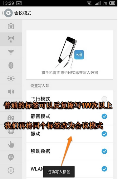 1、有時(shí)候我們需要將NFC里的數(shù)據(jù)更換或者是重新設(shè)置,這個(gè)時(shí)候怎么辦呢?其實(shí)方法很簡單的,和“寫入標(biāo)簽”的方法是一樣的,比如小編要改為“會(huì)議模式”。