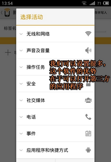 我們除了控制手機(jī)的基本功能外,我們還可以控制某些應(yīng)用程序的開啟,或者發(fā)短信給某個(gè)人,打某個(gè)人的電話。注意,魅族MX3自帶的NFC功能還無法開啟第三方應(yīng)用程序,需要其他軟件的支持。